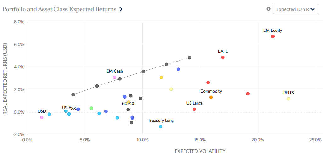 AQR’s bottom line here is very close to Research Affiliates: low returns across the board, better equity returns outside the US, considerable volatility.