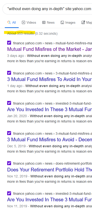 Victoria Odinotska offered a fascinating coda to that piece. Victoria is president of Kanter & Co., which does media relations work for investment firms. (And, based on our experience, does it really well.) She’s also an exceptional person. In any case, Victoria reports that “we are convinced that most of the Zacks articles are written by a machine using a template. It doesn’t matter which fund they write about in one of these write-ups the language is the same.” In a test of Victoria’s suspicion, we searched the phrase “without even doing any in-depth” within the site finance.yahoo.com. The result: