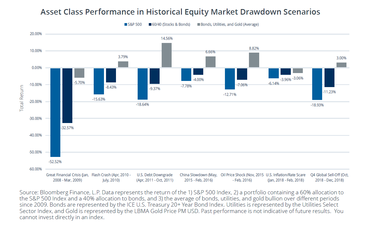 On February 5, 2020, which the Dow at 28,807, Direxion launched the Direxion Flight to Safety Strategy ETF (FLYT). The passive fund tracks an index comprised of gold, large-cap utility stocks, and long-dated US Treasury bonds. It rebalances quarterly, with the least volatile component of the index, based on trailing five-year volatility, receiving the greatest weight.