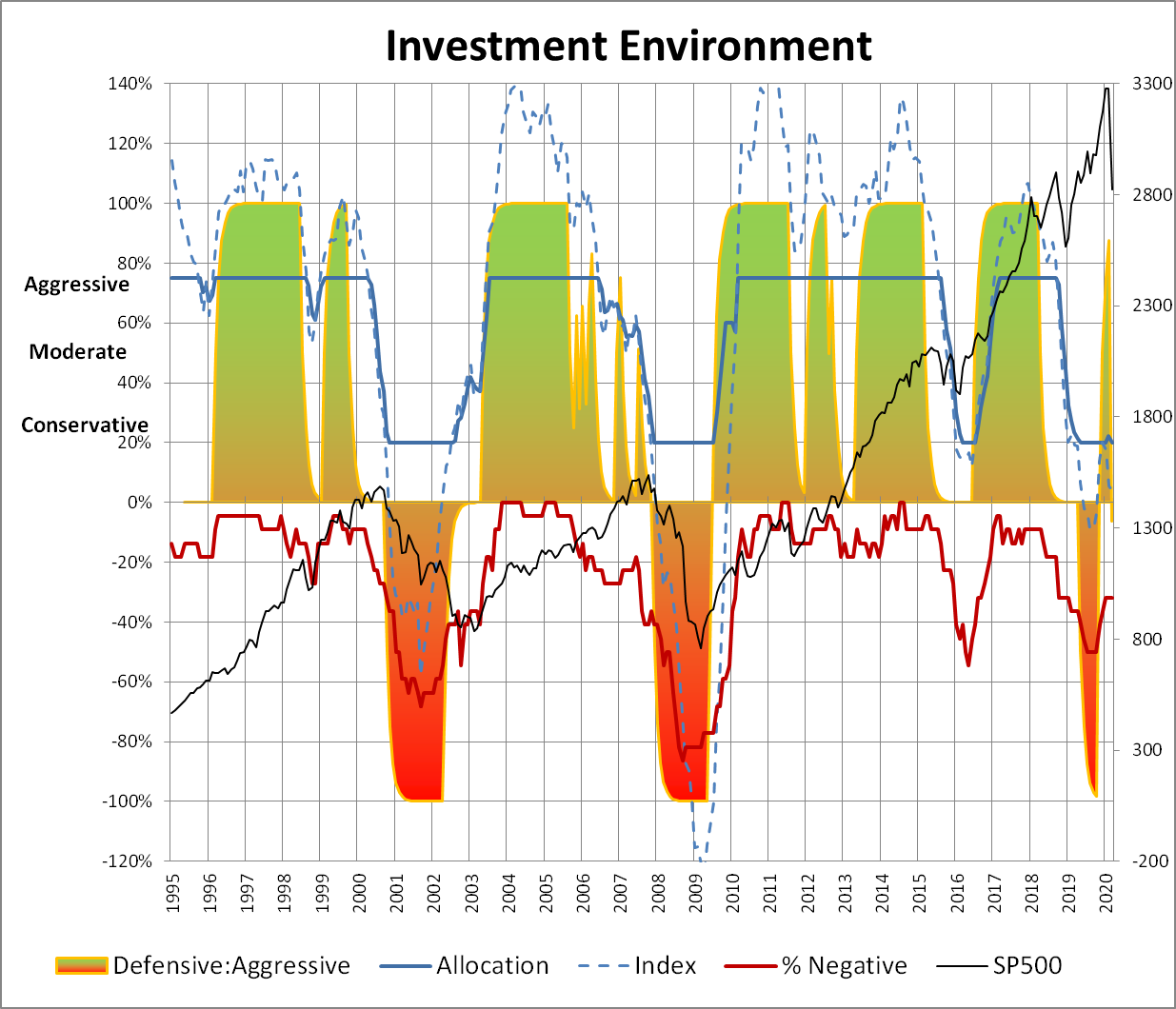 Chart #1 is my Investment Model which is intended to maximize return by adjusting allocations (dark blue line) based on the business cycle. I roughly follow Benjamin Graham’s guidelines of never having less than 25% invested in stocks and never more than 75%. The dashed blue line is the index underlying the Allocation Index before a 20% and 75% cap is applied. It shows improvement in the Investment Environment since September 2019 until the fear of the Coronavirus shook investors. The Allocation Index (blue) is now at 20% stocks recommending conservatism. The red line is the percent of indicators that are negative showing there is some improvement.
