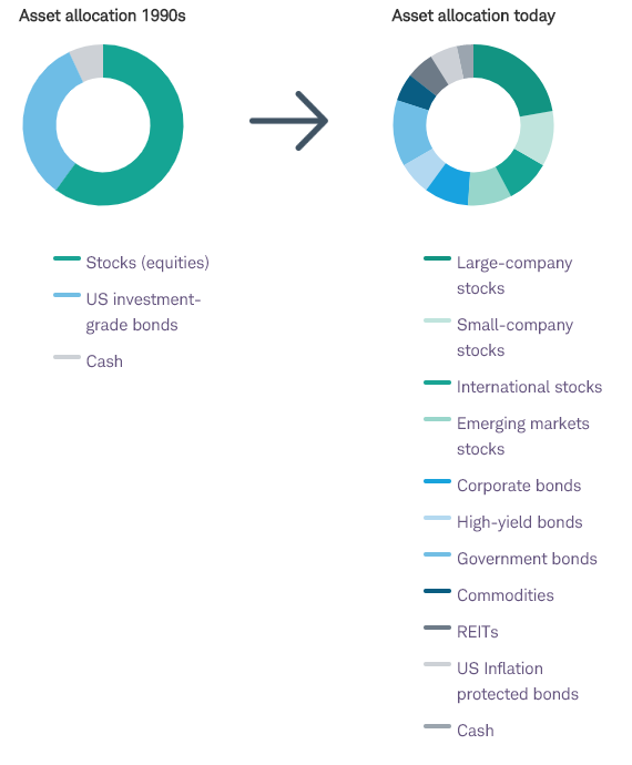 “Schwab Intelligent Portfolios Asset Allocation White Paper” describes evolving theories of asset allocation. Correlations of equities have become much higher over the past 25 years. Allocations across diverse assets can reduce risk in portfolios. In this environment of lower expected stock returns and low-interest rates, asset allocations may be evolving as they show in the hypothetical allocation below.