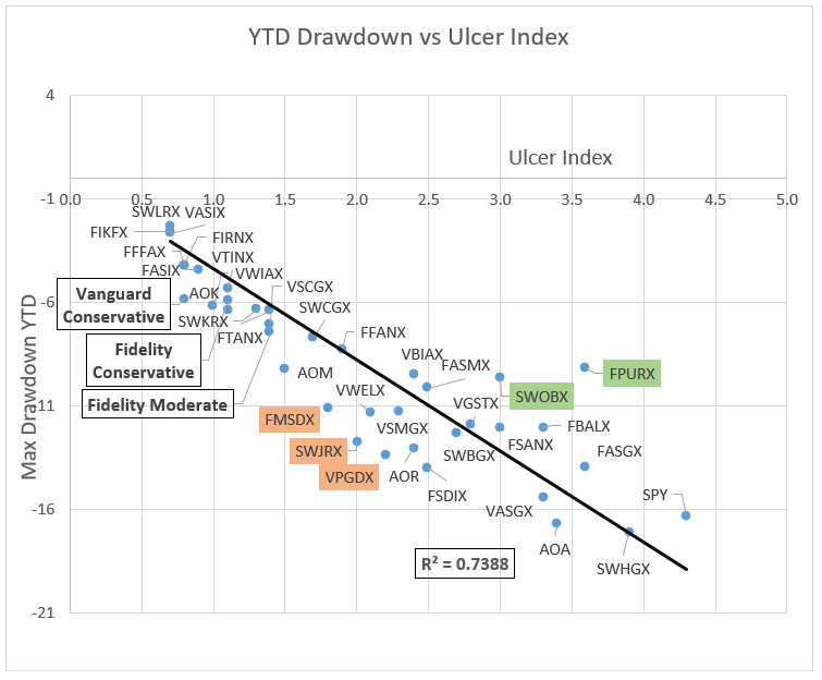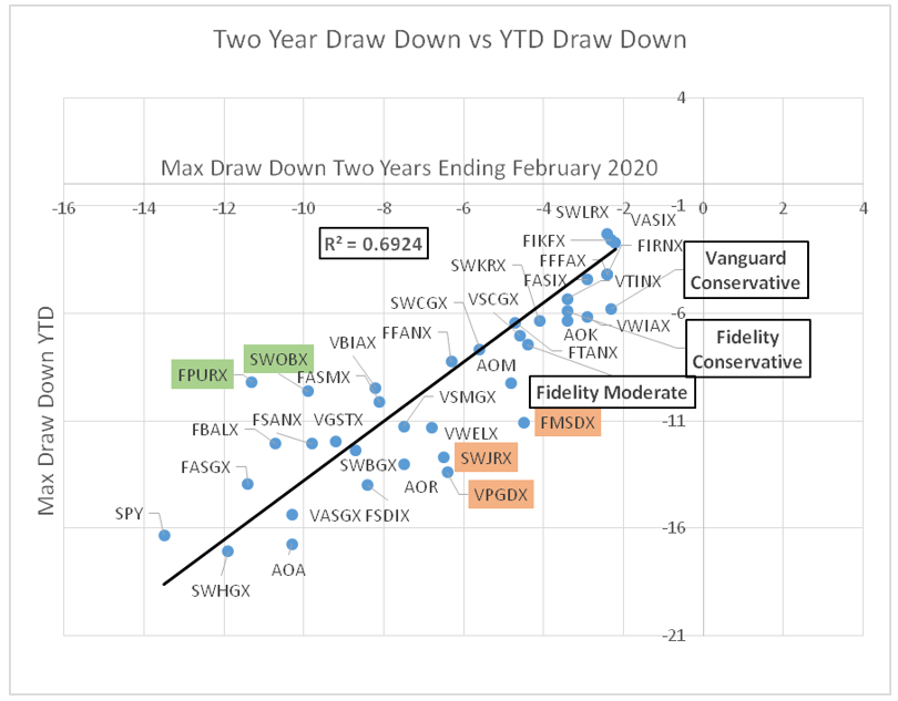 Chart #9 is intended to answer if the drawdown of the mixed asset funds from Charles Schwab, Fidelity and Vanguard in 2020 (vertical axis) follow the same trends in drawdown for the past two years ending February 2020 (horizontal axis). In other words, can the risk in a fund over the past two years accurately reflect the risk going forward over short time periods? Vanguard Conservative, Fidelity Conservative, and Fidelity Moderate are Personal Target Portfolios that I cover in the next section. There is a good correlation (0.69) between the drawdowns for the two time periods.