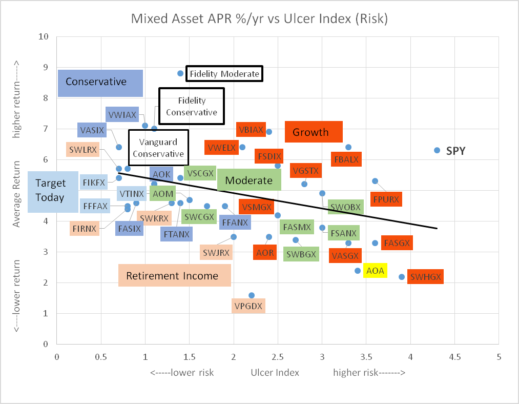 How has your portfolio compared to the market or other portfolios? Does it offer sufficient reward for the risk that you are taking? Chart #1 contains the mixed-asset funds from Charles Schwab, Fidelity, and Vanguard grouped by Lipper Category. The horizontal axis is the Ulcer Index (risk) compared to the average return over the past two years ending February on the vertical axis. Notice that for the past two years, higher risk funds have had low or negative incremental returns. Secondly, notice that the Lipper Categories cover a wide range of risks and returns. In other words, some of the conservative funds have a higher risk than some of the moderate funds, and so on. My personal target portfolios are shown as Vanguard Conservative, Fidelity Conservative and Fidelity Moderate Portfolios. This topic is covered in Section 3 and 4 of this article.