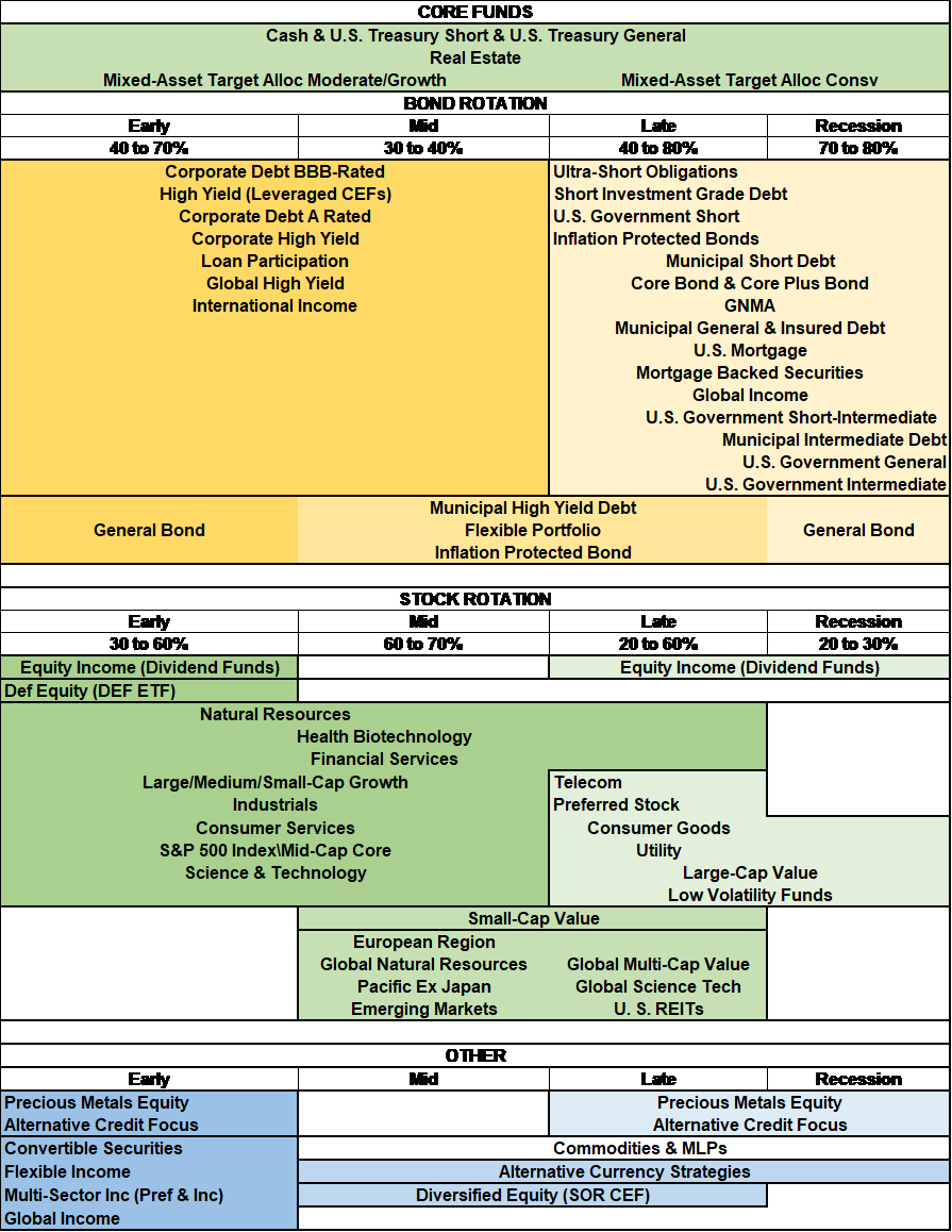 Table #1 shows the funds that do well by business cycle stage. Typically, investors should be invested in growth stocks during the Recovery and Expansion Phase and shift to a value orientation in the Late Stage and Recessions. Real Estate can be good for diversification is all stages. Gold tends to do well in the Late Stage and Recessions.