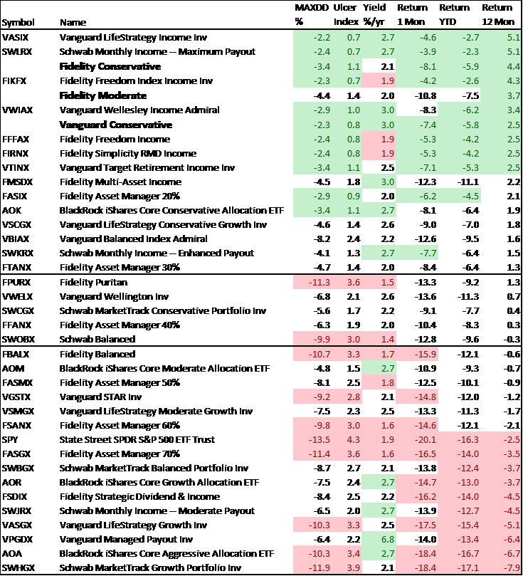 Fidelity Puritan (FPURX) and Schwab Balanced (SWOBX) are two funds that had significantly lower drawdowns in 2020 compared to the last two years. Vanguard Managed Payout (VPGDX), Fidelity Multi-Asset Income (FMSDX), and Schwab Monthly Income – Moderate Payout (SWJRX) had significantly higher drawdowns in 2020 compared to the last two years. The performance of the three Target Portfolios reflected relatively low drawdowns for the past two years and year to date.