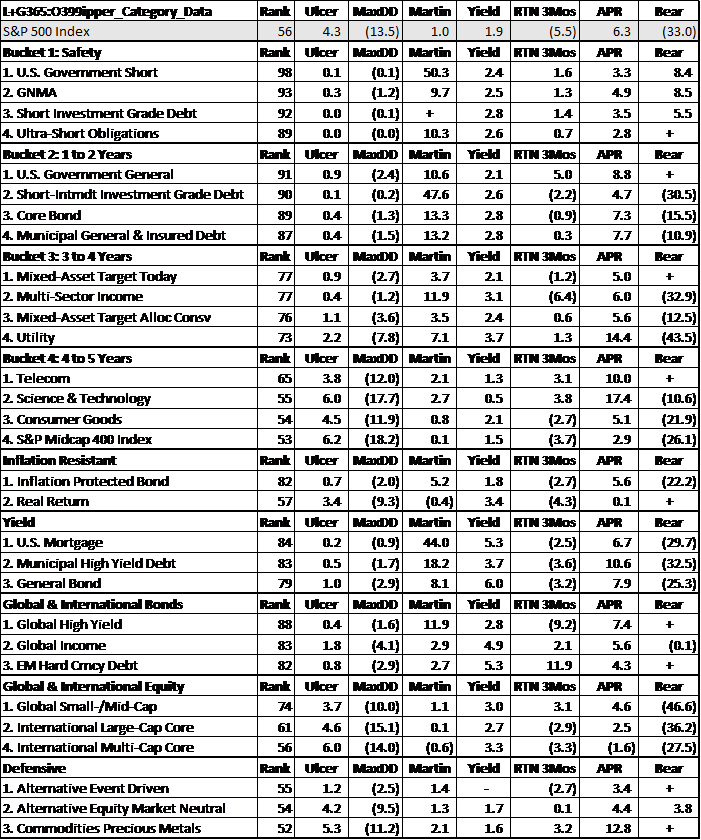 Each month, I extract data for about a thousand funds from the Lipper database using Mutual Fund Observer screens. I rate funds and Lipper Categories based upon risk, risk-adjusted return, income, momentum, and quality factors (including bond quality and stock price to earnings ratio). Table #7 contains the top Lipper Objective along with a representative component of the factors. The “Rank” column is my Ranking System. The way to read the table is that the S&P 500 had an Ulcer Index (Risk) of 4.3 and an average return (APR) of 8.1%, a risk-adjusted return (Martin Ratio) of 1.0% for the past two years ending February. The three-month return is also as of the end of February. I look for funds with lower risk and higher risk-adjusted returns in each of the nine buckets.
