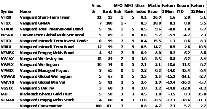 In “Best Practices for Portfolio Rebalancing,” Vanguard advises against trying to time the markets when rebalancing. They study three methods for timing the rebalancing of portfolios. The one that I like is the “Threshold Only” method where limits are set on the portfolio and the portfolio rebalanced when the allocations exceed targets by these thresholds. The new Mutual Fund Observer Portfolio Tool (MFO Premium access required) is a great “keep it simple” tools for the individual investor. One of the criteria for rebalancing my portfolios will be that the portfolio maintains a Conservative Risk Rating from Mutual Fund Observer.