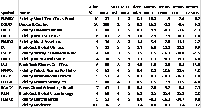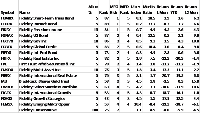 In March, I wrote an article describing Fidelity mixed-asset funds. Since then, I have adjusted my portfolios and created two Fidelity Target Portfolios. The Fidelity Conservative Target Portfolio is shown in Table #11. It contains 35% stocks.