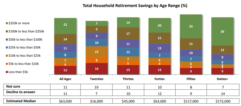 Fidelity has an excellent retirement planning tool, recommends saving 15 percent of your income annually, and to start saving as soon as you can. Their rule of thumb is to have 10 times your income saved by age 67. The median household income is around $55,000 which implies median retirement savings of $550,000 or higher by retirement age. A typical, general target is to save one million dollars or more.