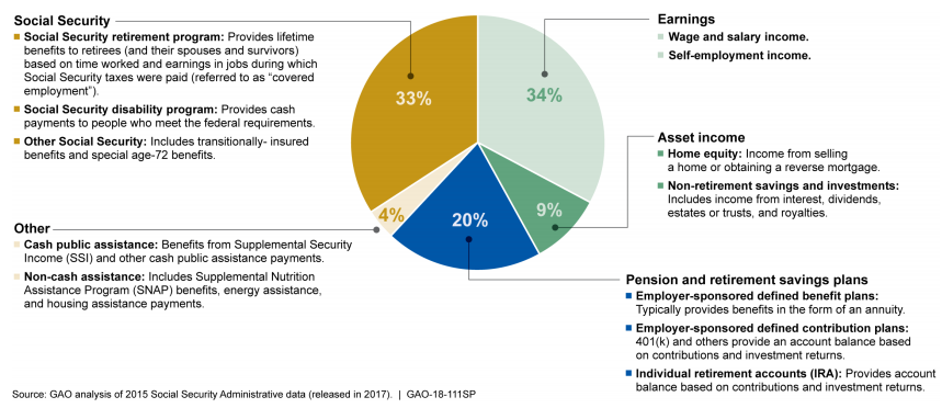 Chart #2 is from The Nation’s Retirement System by the U.S. Government Accountability Office. It shows that Social Security will provide a third of the income for retirees which is more than the 20 percent provided by pensions and retirement savings. People are working longer and a third of the income comes from employment after age 65.