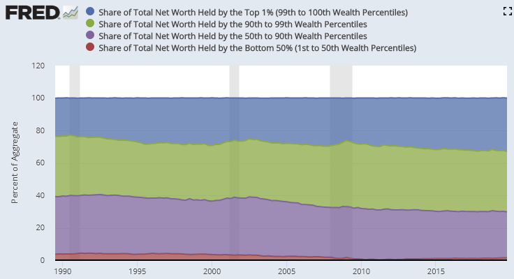 Chart #5 shows the share of net worth held by the Top 1 percent of the population which owns nearly 33 percent of the net worth in the US. The top 10 percent own nearly 70 percent of the net worth and paid 69% (2016) of total income taxes. The bottom 50 percent own 2 percent. There are several explanations for this such as people nearing retirement own more than those starting their careers. Education levels play a large role in wealth accumulation. These metrics don’t include sales and other taxes which disproportionally are a higher percentage of disposable income for lower income people.