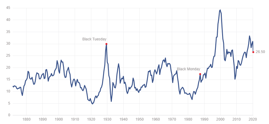 Right now, the Shiller PE is 26.5. The good news: that’s down from the 2019 peak when US stocks were the second most expensive in the last 140 years. The not-yet good news: that’s still mightily above the 140-year average price of about 16.