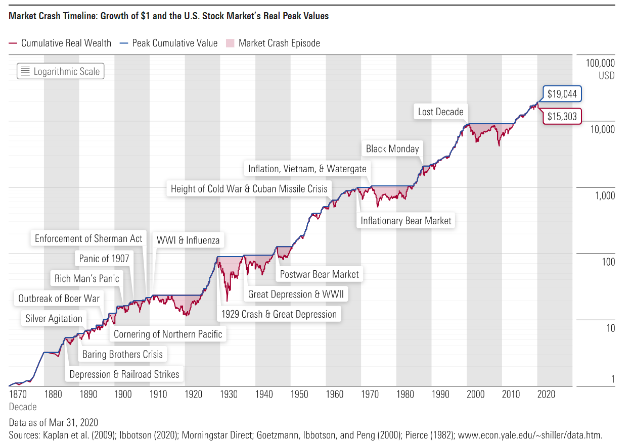Markets go up, markets go down. For those with a short time horizon and a large exposure to the stock market, that can be devastating. For you, folks with a long time horizon and small exposure to the stock market (relative to your lifetime investments), it’s mostly noise. The good folks at Morningstar created (What Prior Market Crashes Can Teach Us About Navigating the Current One, 4/16/2020), and gave us permission to share, a picture of the long-term significance of short-term terrors.