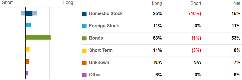 Below is my personal allocation with 26 percent in stocks, 53 percent in bonds, 15 percent in Short-Term investments (including money market funds and certificates of deposit), and 6 percent in gold (Other).