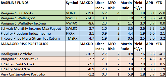 The performance of baseline funds and the model portfolios are shown below. Ulcer Index is a measure of risk and is the depth and duration of drawdowns. Martin Ratio is the risk-adjusted return and is the risk-free return divided by the Ulcer Index. The data shows that conservative funds are outperforming aggressive funds year to date.