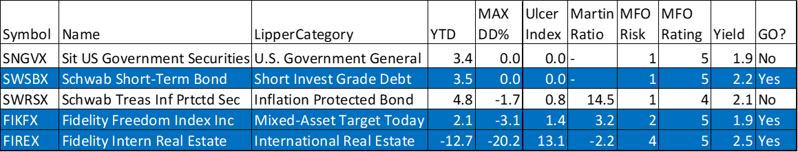 This month, I exchanged the Fidelity International Real Estate Fund in the Model Fidelity Moderate Portfolio (because it had the highest Ulcer Index in the Portfolios) and replaced it with the more conservative Fidelity Freedom Index Income Fund (FIKFX) while the market is up. I also exchanged money market funds in the “Very Conservative Portfolio” with the Sit US Government Securities (SNGVX) and Schwab Short-Term Bond Fund (SWSBX). The funds are shown in Table #2 below.