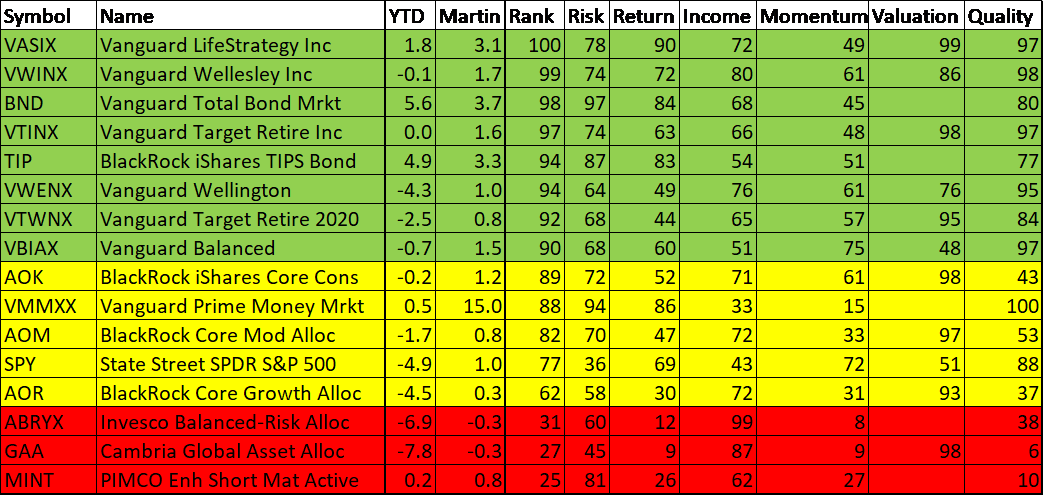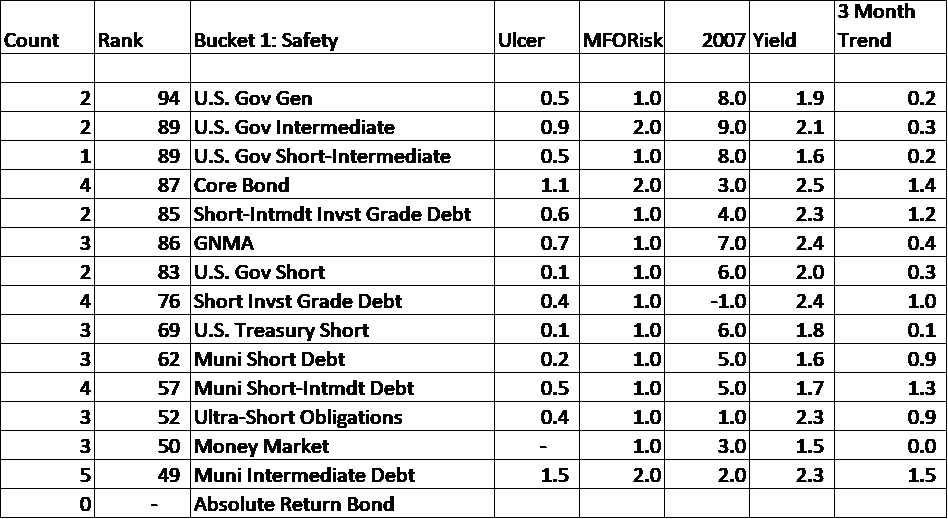 The Ranking System is built upon the foundation that past trends and behaviors over the recent history and during past market downturns are representative of future behavior. Since history does not repeat itself, but it does rhyme, the Bucket approach is a guideline to diversification. The Ranking System is revised as I have time to review the Mutual Fund Observer metrics.