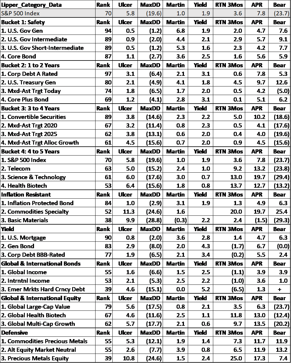 Investors use the Bucket approach to match market risk with withdrawal needs. I use a four Bucket Approach based on the Ulcer Index with “1” having the risk of money markets and short term treasuries and “4” having the risk of the S&P 500 or higher. For diversification purposes, I have a bucket set up for International/Global Bonds and one for International/Global stocks. I have a separate bucket for Income because high-income funds usually come with their own set risks. Finally, I have two buckets set up to track the business cycle as “Inflation” and “Defensive”. The following table shows the automated results for the top Lipper Category for each of the buckets. By comparison, the Ulcer Index of the S&P 500 is 6.2 and the Martin Ratio is 1. As a general observation, the top-rated funds have an Ulcer Index less than the S&P 500 and a Martin Ratio close to 1.0 or higher.