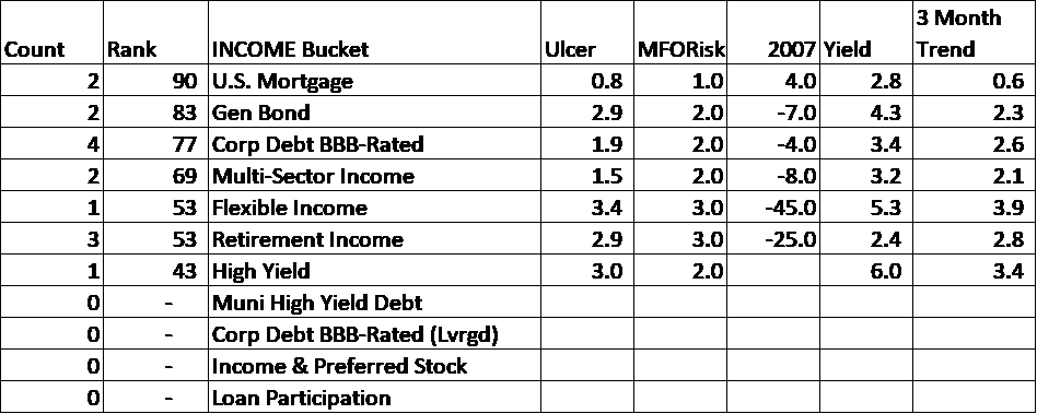 There can be cross over between the buckets as shown in the INCOME Bucket. I use the INCOME Bucket to identify funds with higher yield which is usually associated with higher risk.