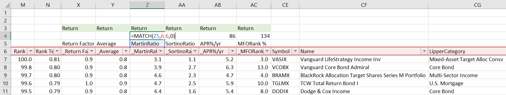 In the screenshot below, these funds are pasted into the range starting with CE6. The green cells are metrics that I include in the Return Factor: Martin Ratio, Sortino Ratio, Return during the period, and MFO Rank. Note that the name of the metric is on line 5, while the column titles of the data are on line 6. Cell Z4 contains the equation MATCH which finds “MartinRatio” in line 6 and returns that “MartinRatio” is found in the 92nd column just like “MFORank%” is found in the 134th column.