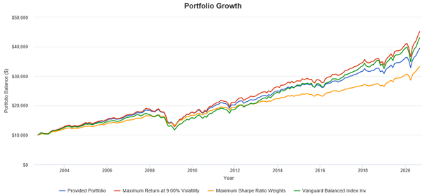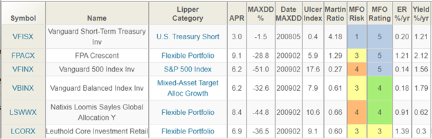 For this article, I used the MFO Premium fund screener to select the funds by age group, and Portfolio Visualizer (PV) to create three portfolios: 1) Equal Weight, 2) Maximum Return with volatility equal to the Vanguard Balanced Index Fund, and 3) Maximum Sharpe Ratio. I limited allocations per fund to 20%. Table #3 contains the MFO metrics for 20 Years, and Table #4 contains the PV results. The three portfolios performed as well as the Vanguard Balanced Fund, but the advantage is that they follow a bucket approach with short term funds in safer buckets for withdrawals. FPA Crescent (FPACX) is the standout fund. Notice that Loomis Sayles Global Allocation Fund remains a fund selected by Portfolio Visualizer to maximize return at the same volatility as the Vanguard Balanced Fund throughout the following time periods. Notice that the portfolios outperformed the Vanguard Balanced Fund until the past 8 years which may be a distortion of quantitative easing. The link to Portfolio Visualizer is here.