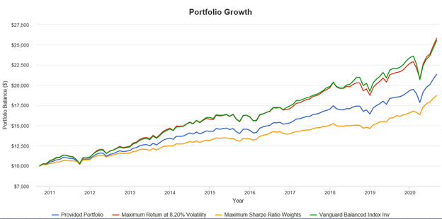 | Ticker | Name | Provided | Max Rtn @ 8.2% Vol | Max Sharpe | VBINX |