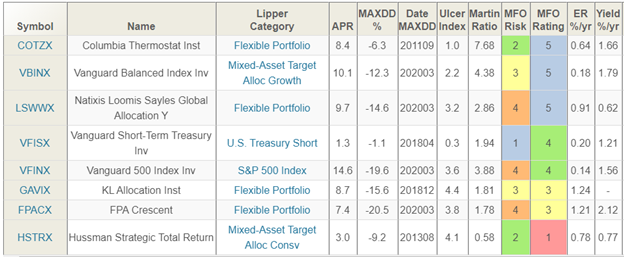 The KL Allocation Fund (GAVIX/GAVAX) is added to the funds to be considered for the 10-year analysis. This time period covers the QE driven bull market with no major dips. Columbia Thermostat (COTZX) is the outstanding fund. GAVIX and HSTRX are lower risk, but with lower performance. Portfolio Visualizer favors COTZX, GAVIX/GAVAX, and to a lesser extent HSTRX. The link to Portfolio Visualizer is here.