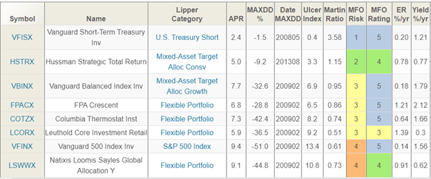 Columbia Thermostat (COTZX) and Hussman Strategic Total Return (HSTRX) are added to the option of funds to evaluate funds for the past 18 years. These funds replace LCORX as optimized funds in Portfolio Visualizer. The standout fund is HSTRX, and FPA Crescent continues to be a top performer. Again, the only advantage is the bucket approach. The link to Portfolio Visualizer is here.