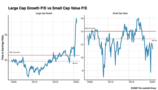 Many champions of “the Newest New Normal” say that looking at centuries of market history is a delusion since “Everything is Different This Time.” Being an agreeable bunch of quants, the Leuthold Group shortened their time horizon to look at 2020 purely in the light of the past 15 years. Even by the standards of the recent past, the behavior of the large / growth segment of the market is … umm, crazy.