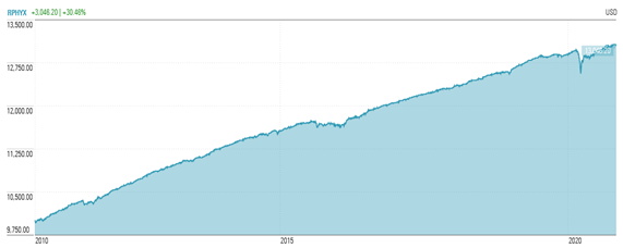 The RiverPark Short Term High Yield Fund (ticker symbols RPHIX and RPHYX) celebrated its 10th anniversary on September 30, 2020. Over the ten years since its inception, the Fund has generated an annualized return of 2.96% and a Sharpe ratio of 2.89, which is the highest Sharpe ratio for any non-money market mutual fund tracked by Morningstar over that period. The Fund currently has about $725 million in assets, and while it had been closed in prior years, it is now open to new investors. (emphasis added)