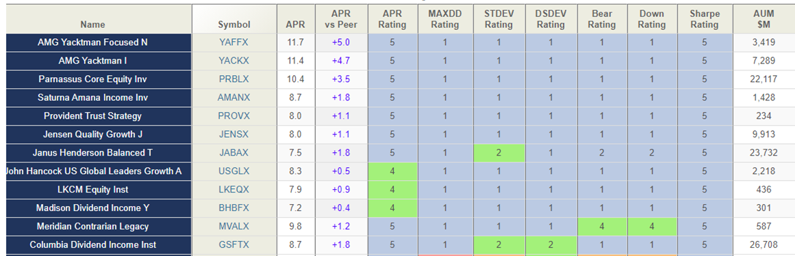 Using the screener at MFO Premium, we looked for ways to make the most relevant information comprehensible at a glance. We did that by identifying ratings that focus on returns (APR rating), risks (maximum drawdown, standard deviation, downside deviation, bear market performance, down market performance), and the risk-return balance (Sharpe rating). In our system, a blue box always represents a value in the top 20%, a green box is a value in the next 20%, yellow is the third tier, and so on.