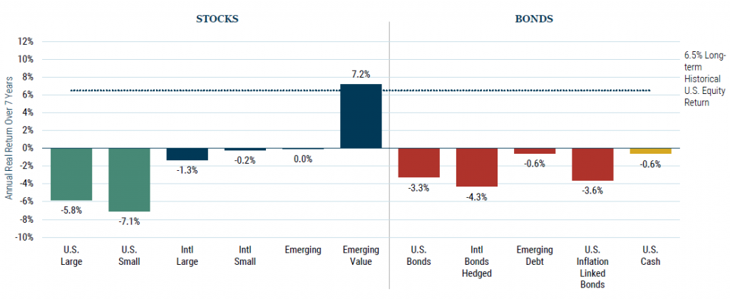 Almost all asset class projections have emerging markets, and often E.M. value, outperforming all other asset classes over the next 5-10 years. The starkest is GMO’s 7-year asset class projection, below, but the same point is made by major investors from Research Affiliates to BlackRock.