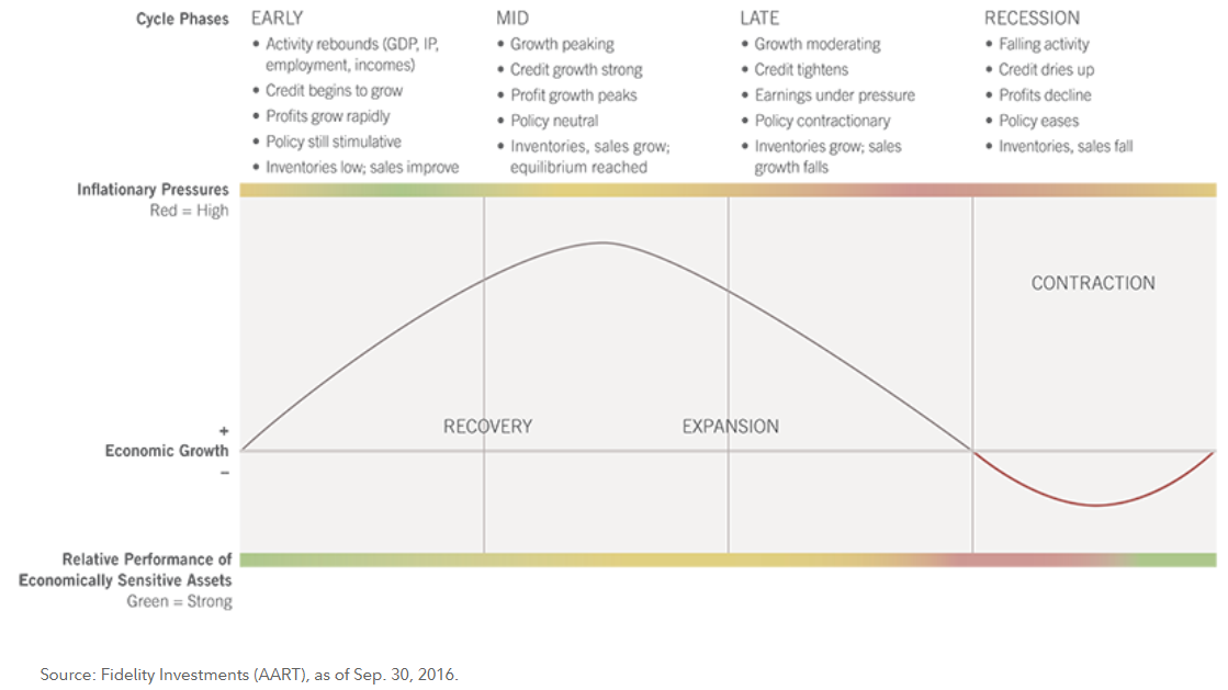 Figure #1 is Fidelity’s concept of a typical business cycle divided into four stages. During these stages, different funds will over or underperform.