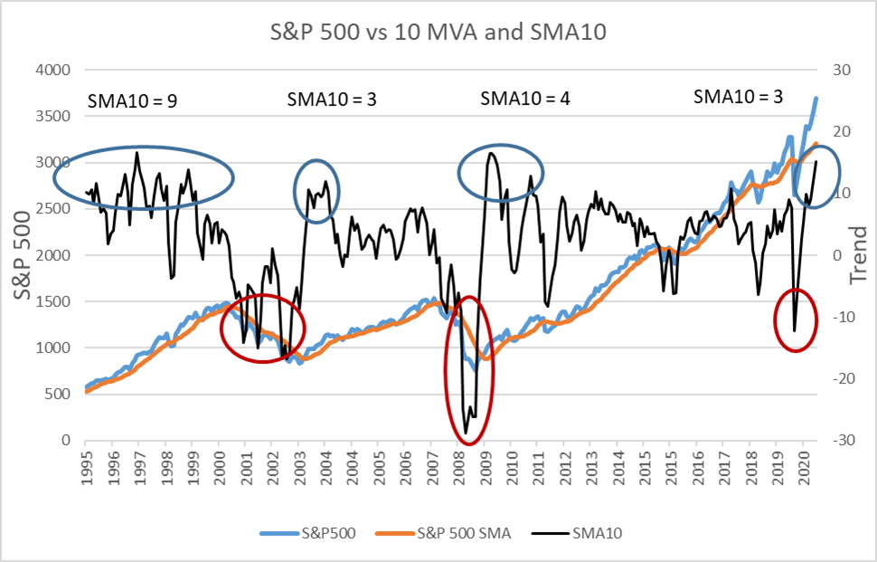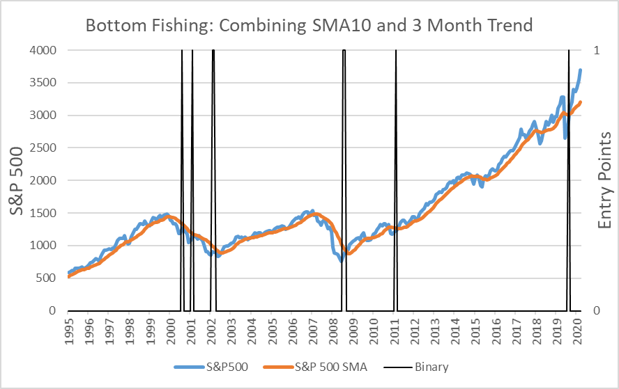 Figure #5 creates a line where the SMA10 is less than -2 and the three-month trend is greater than 2. This line is a reasonable representation of low points in the S&P 500 when it has started to recover.