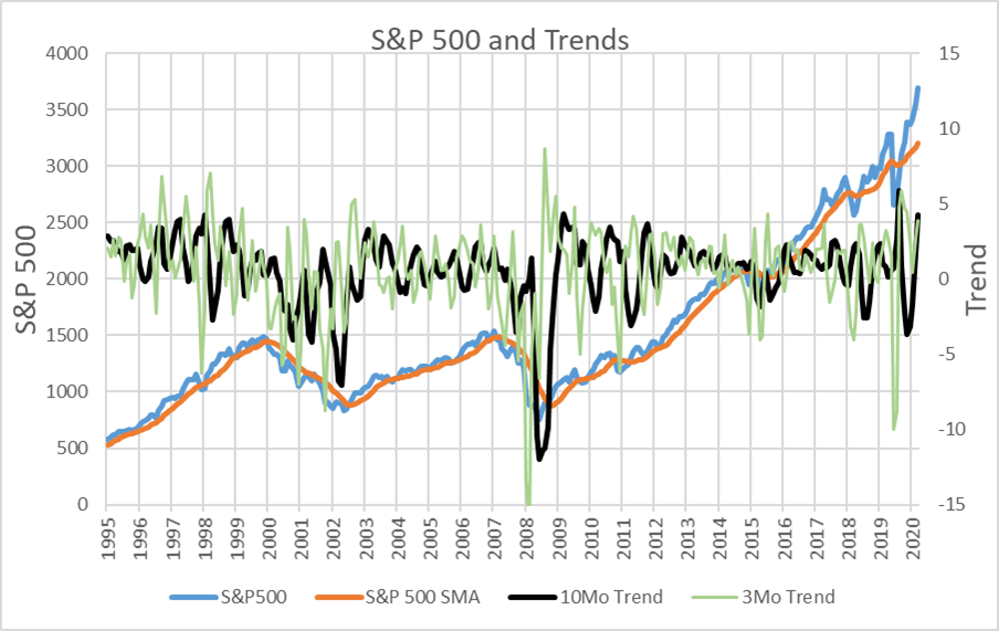In Figure #4, I show the three- and ten-month trends for the S&P 500. These are too noisy to use by themselves.
