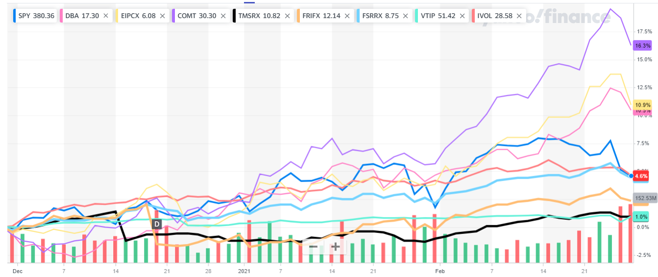 This past week has seen some significant market turmoil as the yield on 10-year treasuries climbed quickly to 1.5% while the S&P 500 dipped 2.5% on Thursday, February 25th. I show the Moving Average Convergence Divergence indicator below. The trends are short-term bearish. In this article, I focus on funds that lost less than a half percent on Thursday and were trending up over the past several months for clues on where to invest with the possibility of inflation rising.