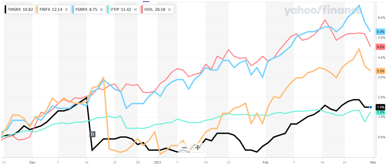 Figure #6 shows the more stable of the funds from the previous figure. I show TMSRX as a baseline fund. I have more faith investing in it over the intermediate-term than I do betting on commodities and inflation. I do own a small amount of inflation-protected bonds for diversification.