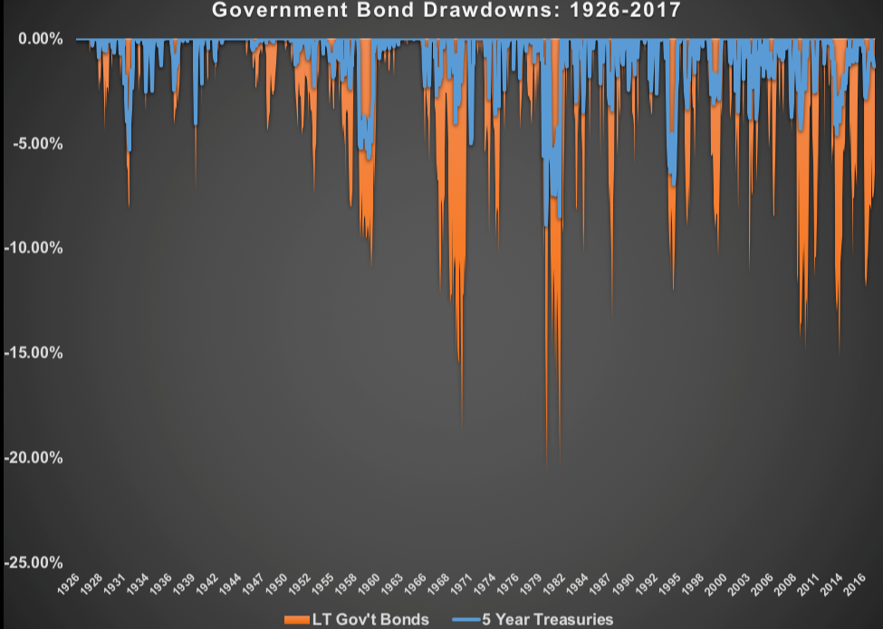 So, a bear market in bonds is much different from a bear market in stocks. The following chart shows the drawdowns in both the five-year Treasury bond and the long-term Treasury bond.1 The biggest losses for both long- and intermediate-term bonds occurred in the 1980-81 period that Dalio mentioned. The maximum drawdown for long-term bonds was just shy of 21 percent, while the five-year note fell 8.9 percent in that time. This was the only period with losses in excess of 20 percent for long bonds. The only time frame that came close was from 1969 to 1970, when long-term Treasuries fell about 19 percent. Five-year bonds have not had a double-digit decline in this period. (What Is a Bond Bear Market Anyways? 3/27/2018)