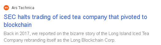 The name change alone caused the company’s stock to triple in value. Now it appears that the proprietors of the Long Island Iced Tea Company weren’t actually at the cutting edge of blockchain technology … indeed, never had anything at all to do with it … though it continues to brew tea.