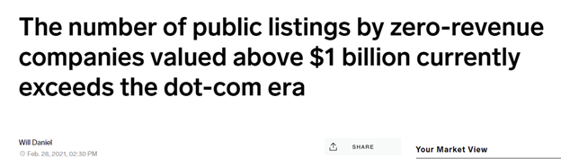 In 2021, 16 companies either have or are expected to go public with a valuation of over $1 billion despite having zero revenues. That’s more than double the number in 1999, three more than in 2001, and two more than in the year 2000, during the height of the dot-com bubble . . . Over 90% of zero revenue companies that plan to go public with over a $1 billion valuation in 2021 thus far intend on using a SPAC to do so.