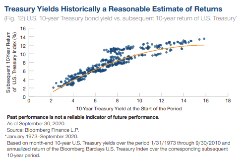 That’s certainly consistent with GMO’s forecast of a real loss of 3 – 4% annually for bond investors over most of the rest of this decade. Research Affiliates “Asset Allocation Interactive” tool forecasts real losses of 0.5 – 3.2% annually for every investment-grade fixed-income class over the next ten years. The yield on 10-year Treasuries was 1.44% (close of 2/26/2021), which was substantially higher than at the start of the month. T. Rowe Price, excellent as ever at pulling things together in their 2021 Global Multi-Asset Outlook, shows that the yield on a 10-year bond strongly predicts your subsequent 10-year returns: