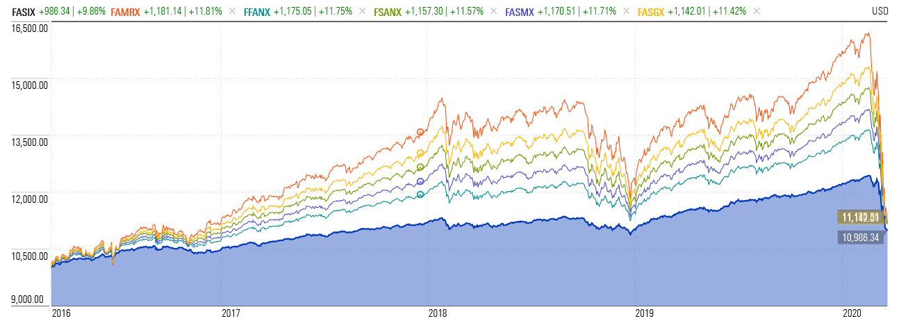 What would have happened if you bought exactly five years ago, but were freaked out by the Covid bear? Oops. The blue field represents the five-year growth of FAM 20, each succeeding line is the performance of sibling fund with more stock exposure.