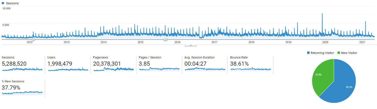 Across the time, the steady heartbeat caused by your coming and going. Below that, the summary of your time with us. Most spectacularly, 1,998,497 people have come by to read the Observer at least once; two-thirds of you have found enough value to become repeat offenders.
