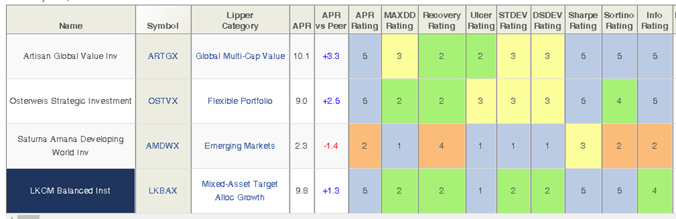 - profiles of four outstanding funds, including Amana Developing World, Artisan Global Value, LKCM Balanced, and Osterweis Strategic Investment.