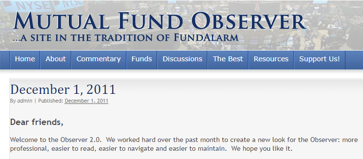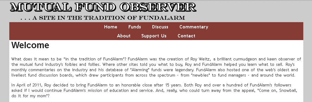 Ten years ago this month, we launched the first issue of the Mutual Fund Observer, “a site in the tradition of FundAlarm.” As the antiquated text below notes, FundAlarm was one of the industry’s most independent, critical voices for 15 years, from 1996-2011. I had the privilege of writing for FundAlarm over its last five years. While the publisher and curmudgeon-in-chief Roy Weitz knew that his time was drawing to a close, he and over 100 readers were sure that the mission of FundAlarm – to be a thoughtful voice and unabashed champion of “the little guy” – was not.