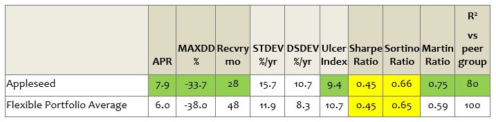 How do you read that? Since its inception, Appleseed has substantially higher returns, a substantially smaller maximum drawdown, and a substantially faster recovery from that drawdown than its peers have. In consequence, the fund’s Ulcer Index (a measure of the depth and duration of drawdowns) is far better but its standard deviation and downside (aka “bad”) deviation are higher. As a result, the standard measures of risk-adjusted return (Sharpe and Sortino) are just average.