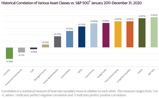 This Asset Class Correlation Map by Guggenheim shows funds that are not correlated to the S&P 500 more clearly. Currency, Cash, Managed Futures, Market Neutral and Commodity funds can be added to the list of funds that are uncorrelated to the S&P 500.