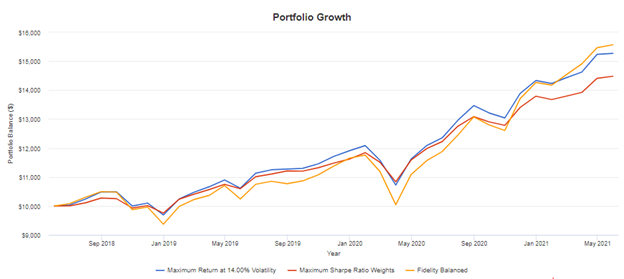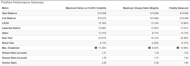 The metrics of the Conservative and Moderate Portfolios are compared to the Fidelity Balanced Fund (FBALX) in Table #5 and the growth of $10,000 is shown in Figure #3. Note that the Moderate Portfolio (Maximum Return at 14% Volatility) only has a standard deviation of 11% compared to 14% for FBALX, but has comparable returns.
