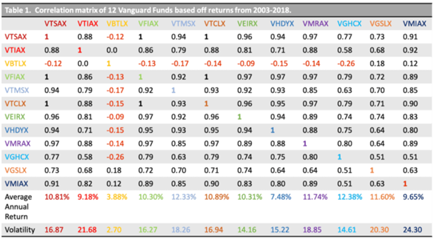 Table #1: Correlation Matrix of 12 Vanguard Funds