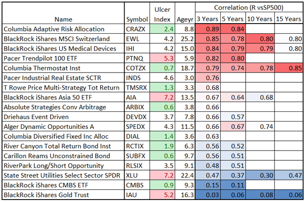 The next table shows the correlation to the S&P 500 over the past 3, 5, 10, and 15 years sorted from highest to lowest. The correlation has remained consistent over longer time periods. The Columbia Adaptive Risk Allocation Fund (CRAZX, CRAAX) has a low Ulcer Index, but the highest correlation to the S&P 500. This means that that it will move in the same direction as the S&P 500, but generally will suffer less than half of the drawdown. The T. Rowe Price Multi-Strategy Total Return Fund has had an even lower Ulcer Index of 1.3 and a much lower correlation to the S&P 500.